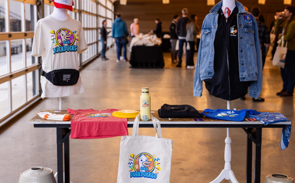 During their November 2025’s All Company Meetup, DuckDuckGo has multiple items for their team members to choose from. They had shirts, denim jackets with custom patches, hats, fannypacks, water bottles, frisbees, pins, socks, bandanas and more.